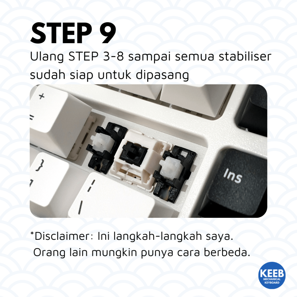 Langkah ini juga untuk memastikan kelengkapan stabiliser, housing, stem dan wire sudah sesuai dengan kebutuhan. Misalnya pada keyboard TKL dan 60%, biasanya membutuhkan 4 x 2u dan 1 x 6.25u atau 1 x 7u. Sedangkan 75% dan 65%, kadang hanya membutuhkan 3 x 2u dan 1 x 6.25u. Jika full size, Anda butuh 7 x 2u dan 1 x 6.25u.