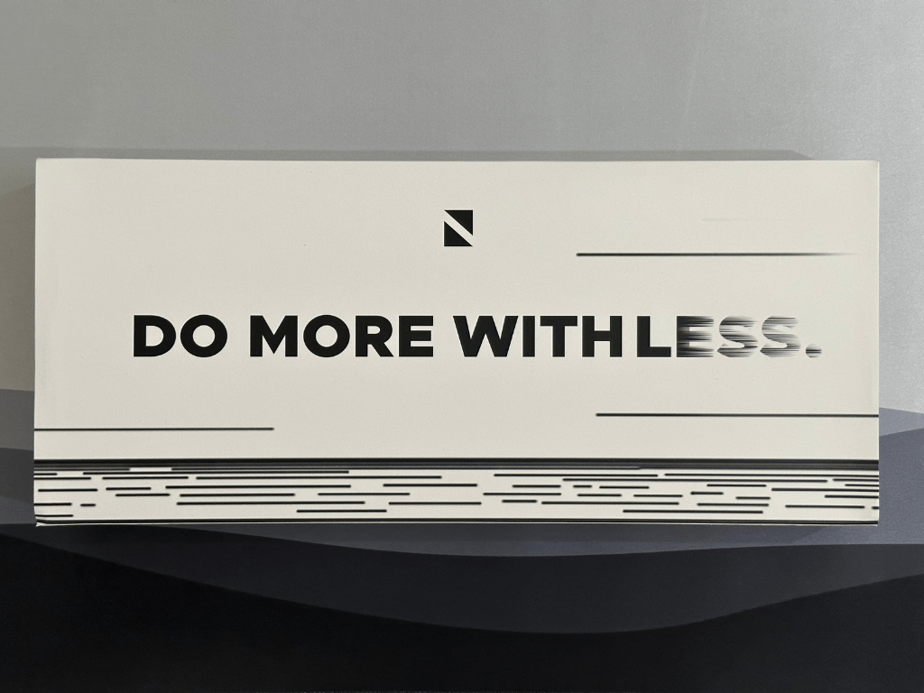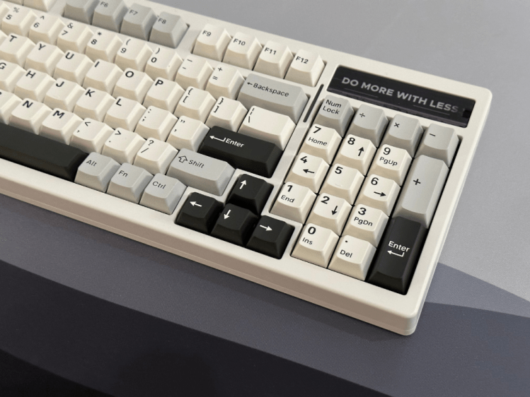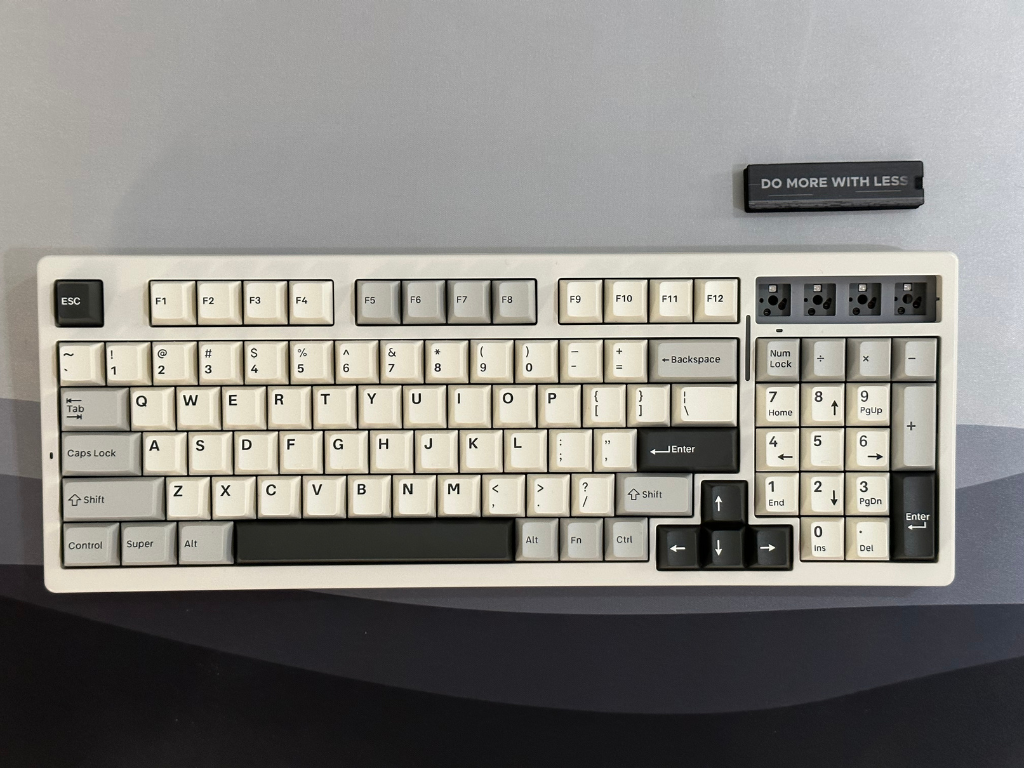 NOIR x YUNZII Vol 1 adalah mechanical keyboard compact full size, 1800 layout dengan removable badge “Do More With Less” di atas numpad. Badge bisa dilepas dan digantikan dengan empat tombol sehingga totalnya 98 tombol. Jika ingin mengganti badge dengan tombol, NOIR sudah menyediakan switch dan keycap yang cocok.