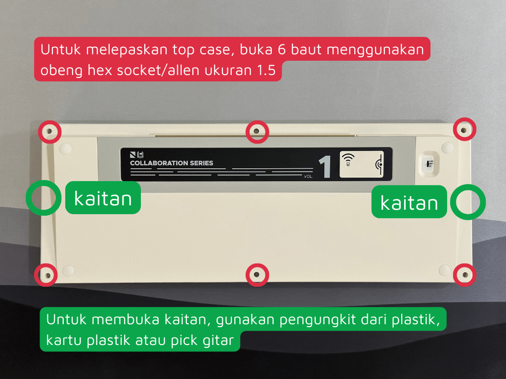 BUKA CASE Untuk membuka case dengan mudah, Anda cukup menggunakan alat dari plastik untuk memisahkan top case dan bottom case.