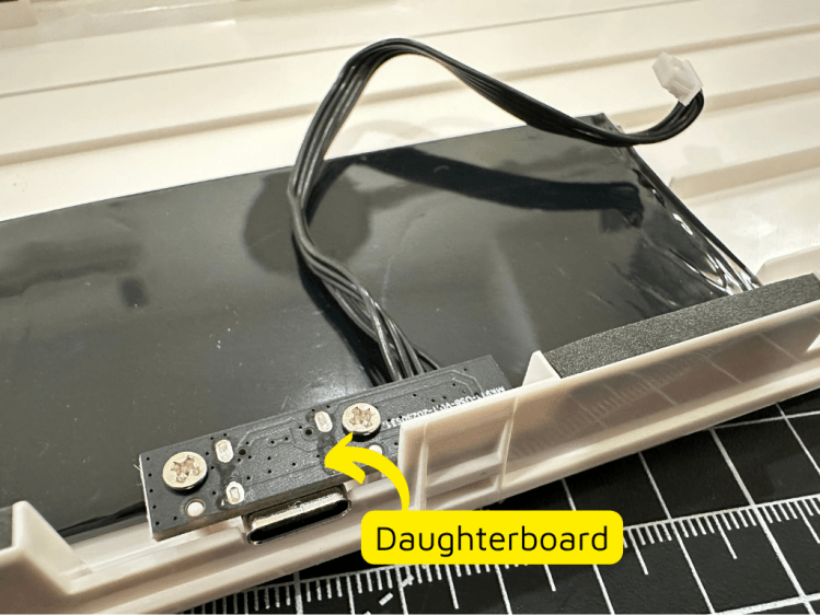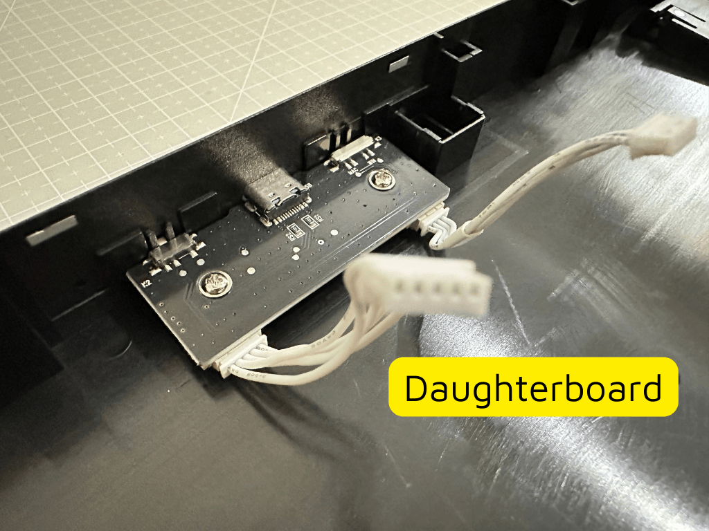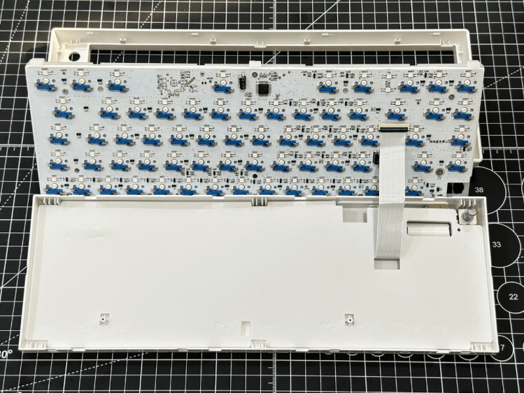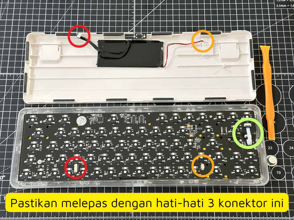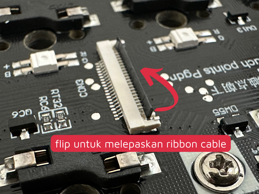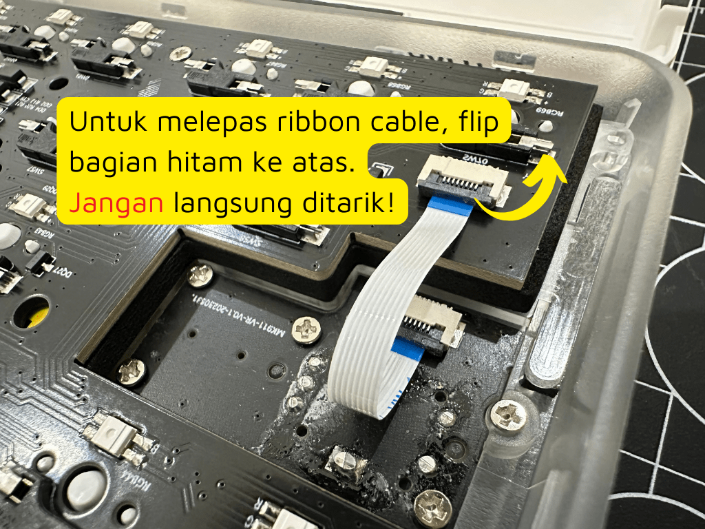 Setelah melepaskan top case, hati-hati ketika mengangkat plate dan PCB dari bottom case karena terhubung oleh ribbon cable ke daughterboard. Untuk melepaskan ribbon cable, angkat bagian yang seperti tuas, kemudian tarik ribbon cable dengan perlahan.