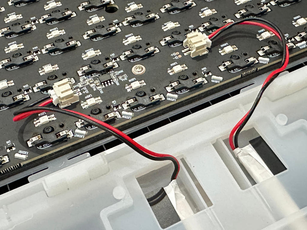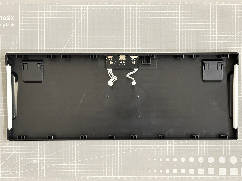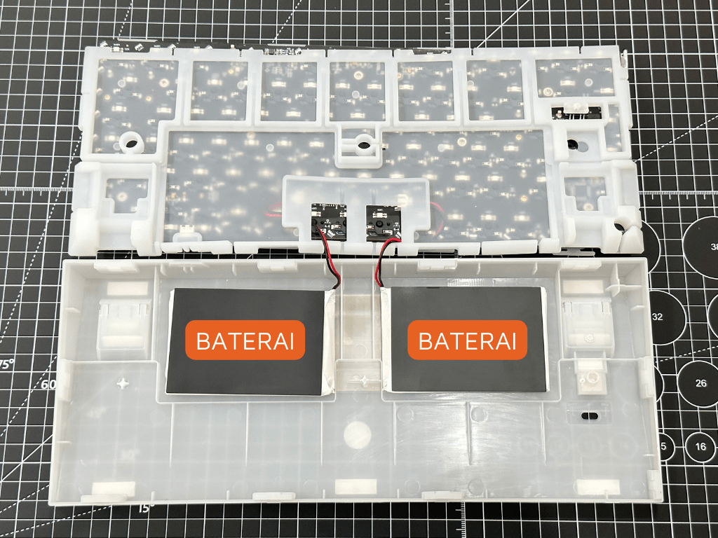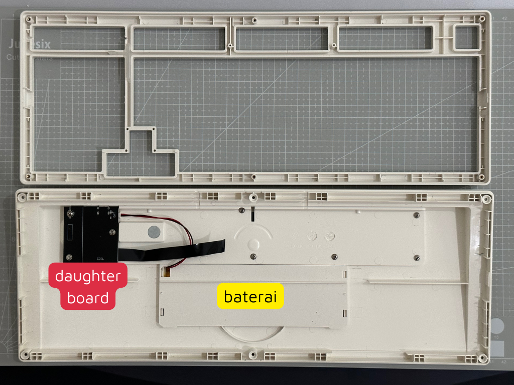 Pada unit saya, ada beberapa dudukan baut yang pecah sehingga saya tidak bisa melepaskan PCB dari bottom case. Saya tidak bisa foto baterai yang berkapasitas 3000 mAh dan Kailh hotswap socket di bawah PCB.