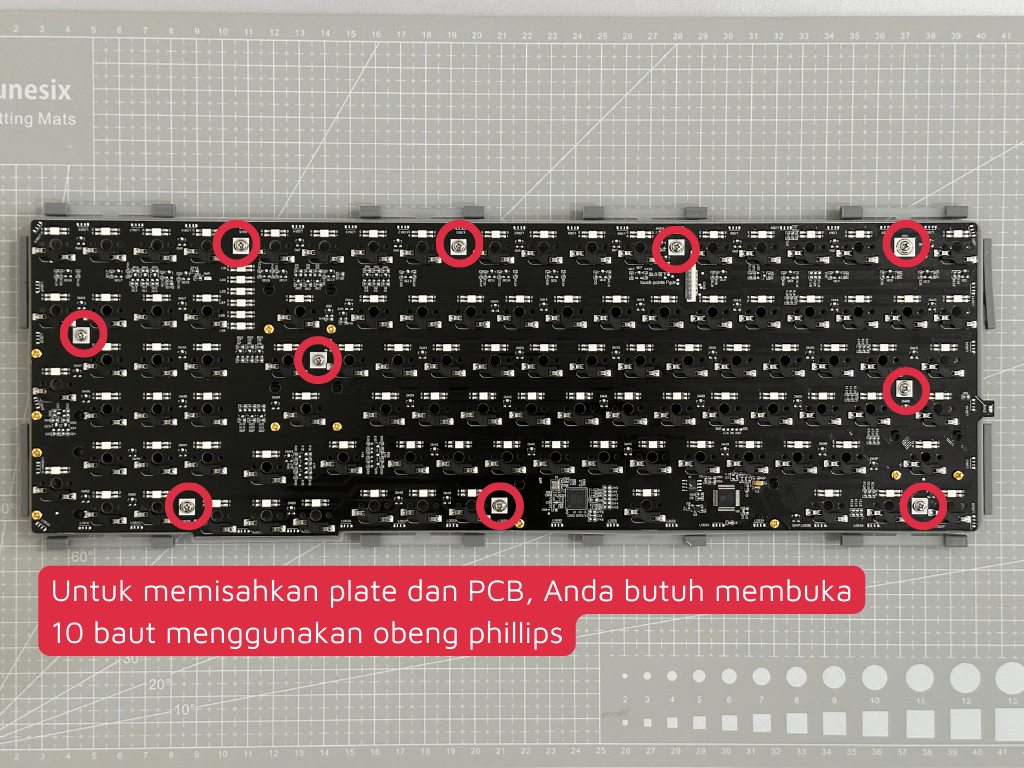 Setelah PCB dan Plate terlepas dari case, Anda bisa memisahkan PCB dan Plate. Tentu saja, Anda butuh melepaskan semua switch terlebih dahulu, kemudian membuka 10 baut yang menghubungkan PCB dengan Plate.