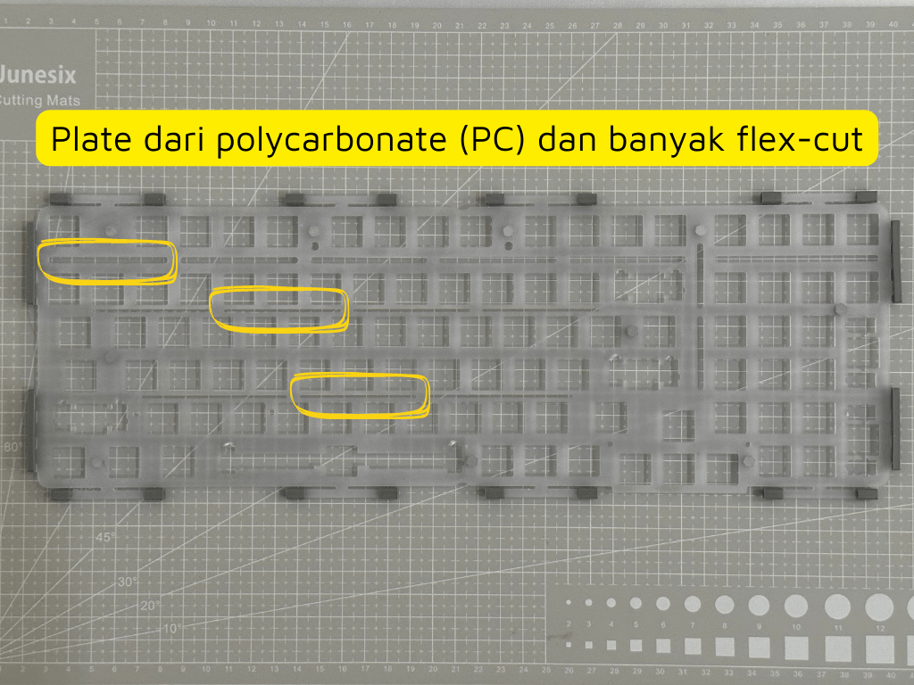 Sepertinya memang polycarbonate (PC) plate ini sedang tren. Akhir-akhir ini banyak keyboard prebuilt yang menggunakan PC plate, tapi Noir x Yunzii memberikan sesuatu yang berbeda, yaitu FLEX-CUT. Ini bisa menjadi salah satu faktor yang membuat suaranya semakin mute.