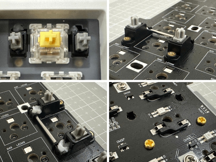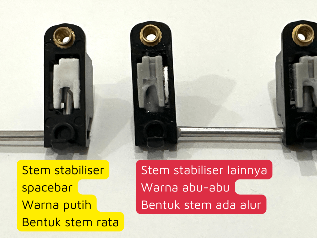 Biasanya saya membahas stabiliser di awal artikel, tetapi kali ini saya membahasnya sebagai bagian dari internal keyboard karena stabiliser PCB mount hanya bisa diakses dan dimodifikasi dengan membuka case dan membongkar semuanya.