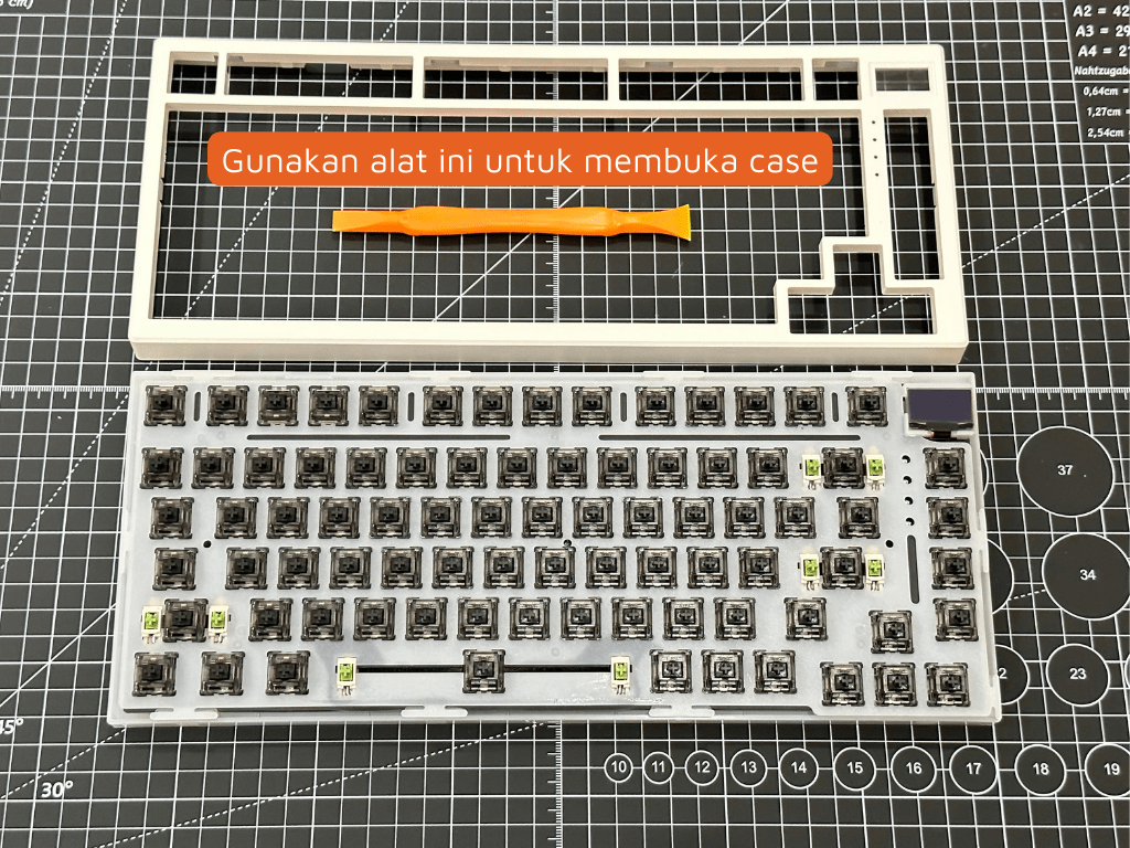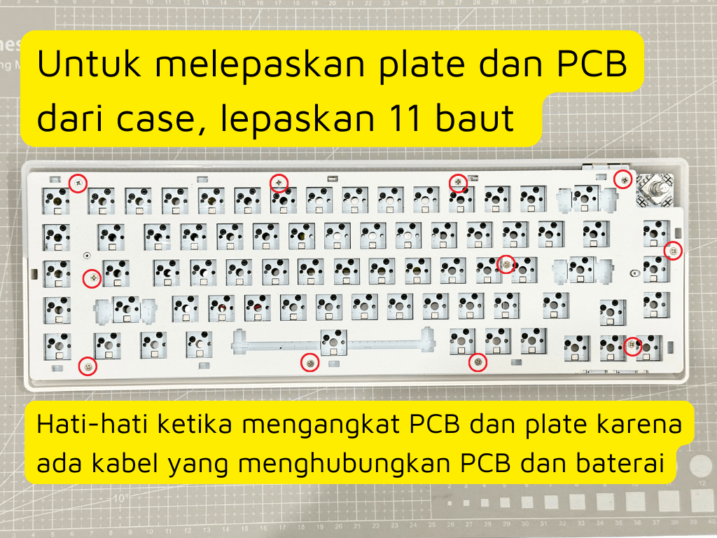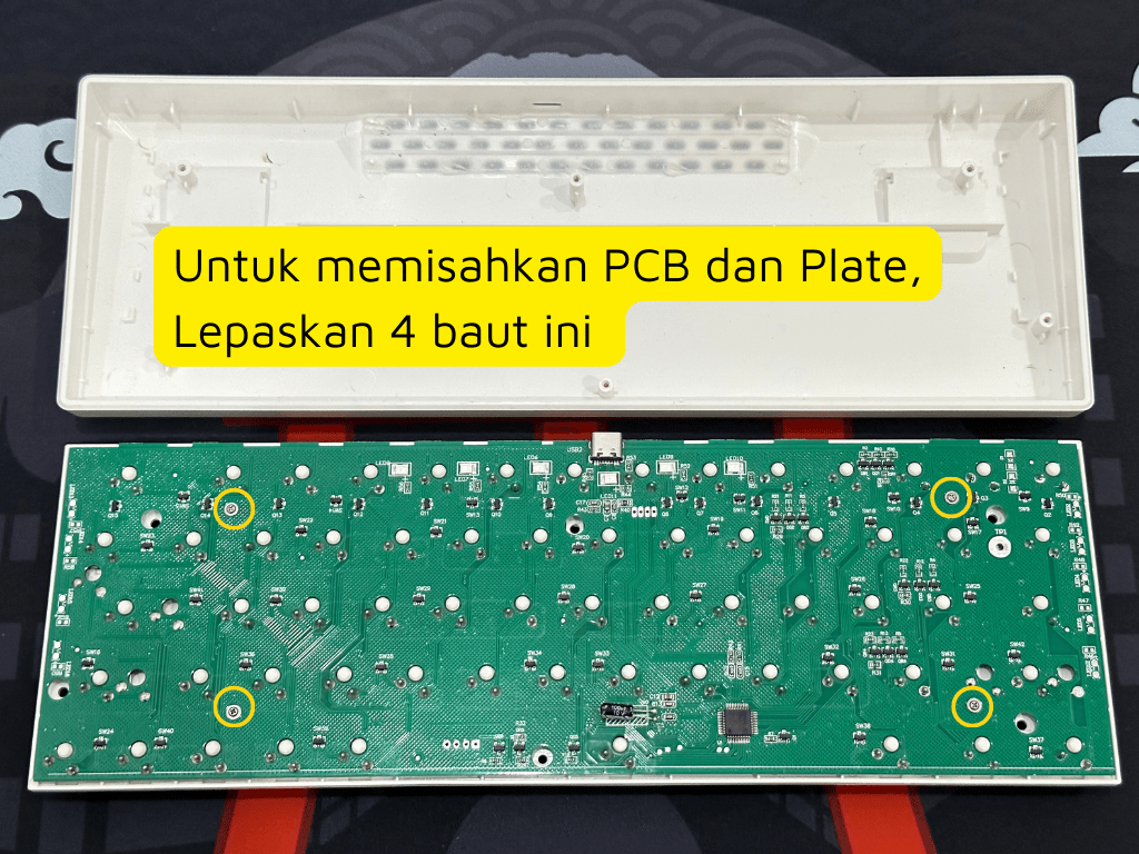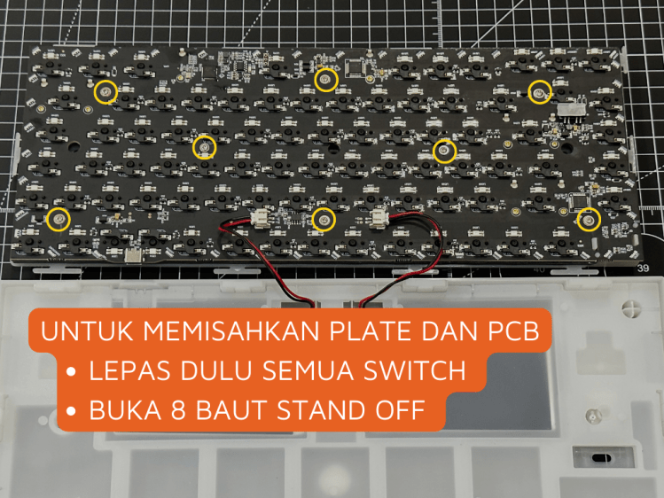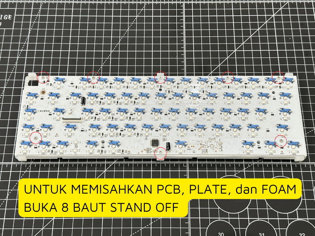 Untuk memisahkan plate dan PCB, Anda butuh melepas semua switch dan membuka 8 baut stand off. Stand off jadi satu dengan plate. Pertimbangan menggunakan stand off pada plate adalah untuk memudahkan pengguna pemula ketika mengganti switch tanpa membuka case.