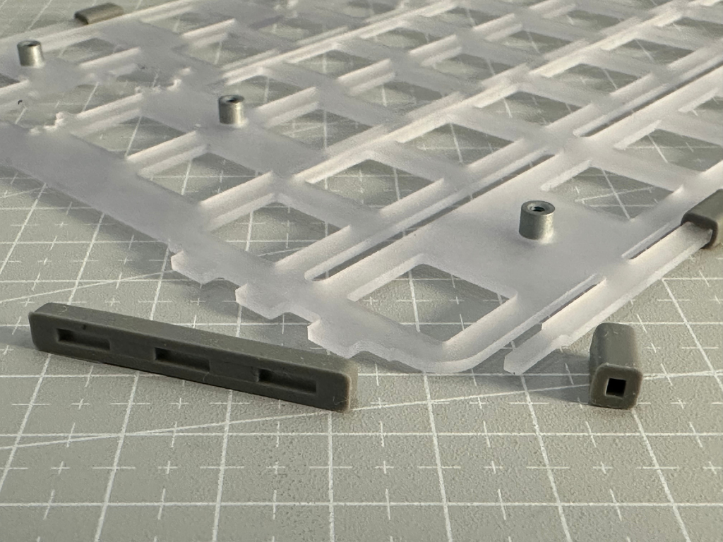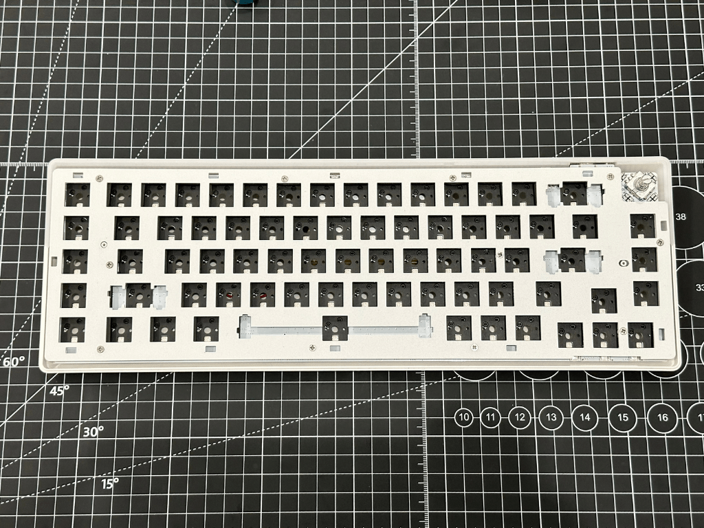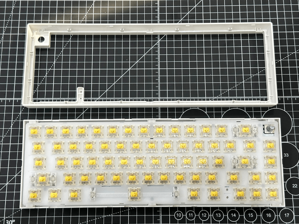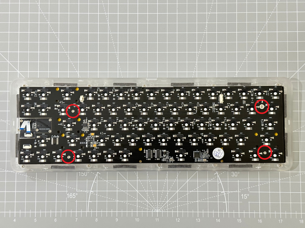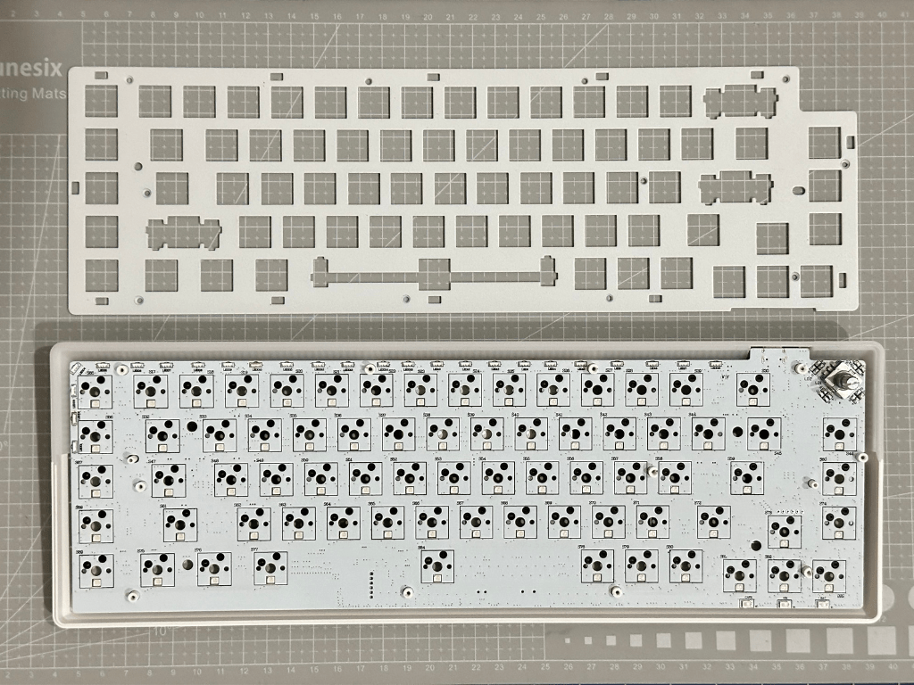 Untuk memisahkan plate dan PCB, Anda butuh melepas semua switch dan membuka 8 baut stand off. Stand off jadi satu dengan plate. Pertimbangan menggunakan stand off pada plate adalah untuk memudahkan pengguna pemula ketika mengganti switch tanpa membuka case.