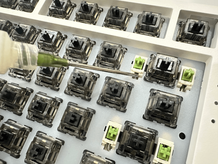 Bila Anda malas untuk membongkar keyboard; membuka case, melepas semua keycap, switch, dan foam hanya untuk melumasi stabiliser, Anda bisa menggunakan Krytox 205g0 dalam kemasan alat suntik dari KEEB. Walaupun ini tidak ideal, tetapi merupakan solusi termudah saat ini.