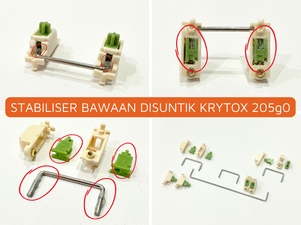 Saya tetap menganjurkan lebih baik melumasi ulang stabiliser bawaan daripada mengganti dengan yang lain karena ukurannya sudah pas. Jika Anda ingin tetap dilindungi oleh garansi, gunakan Krytox 205g0 dalam kemasan alat suntik saja.