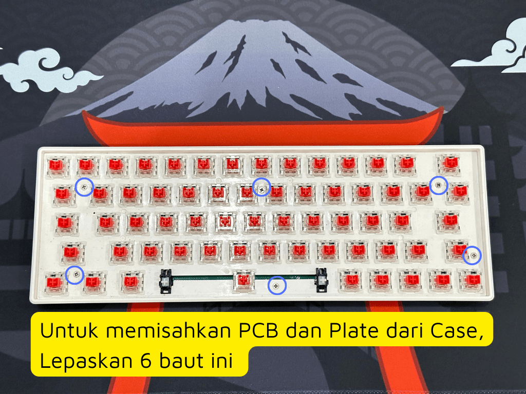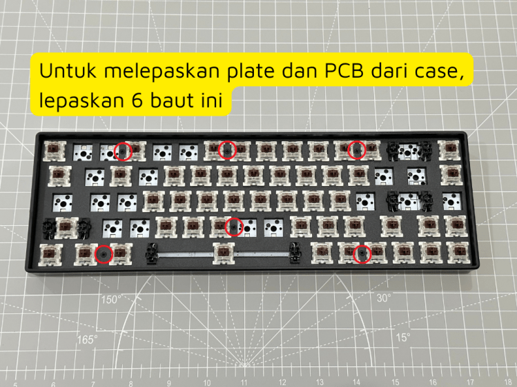 Setelah melepaskan semua switch dan baut, Anda bisa memisahkan plate dan PCB.