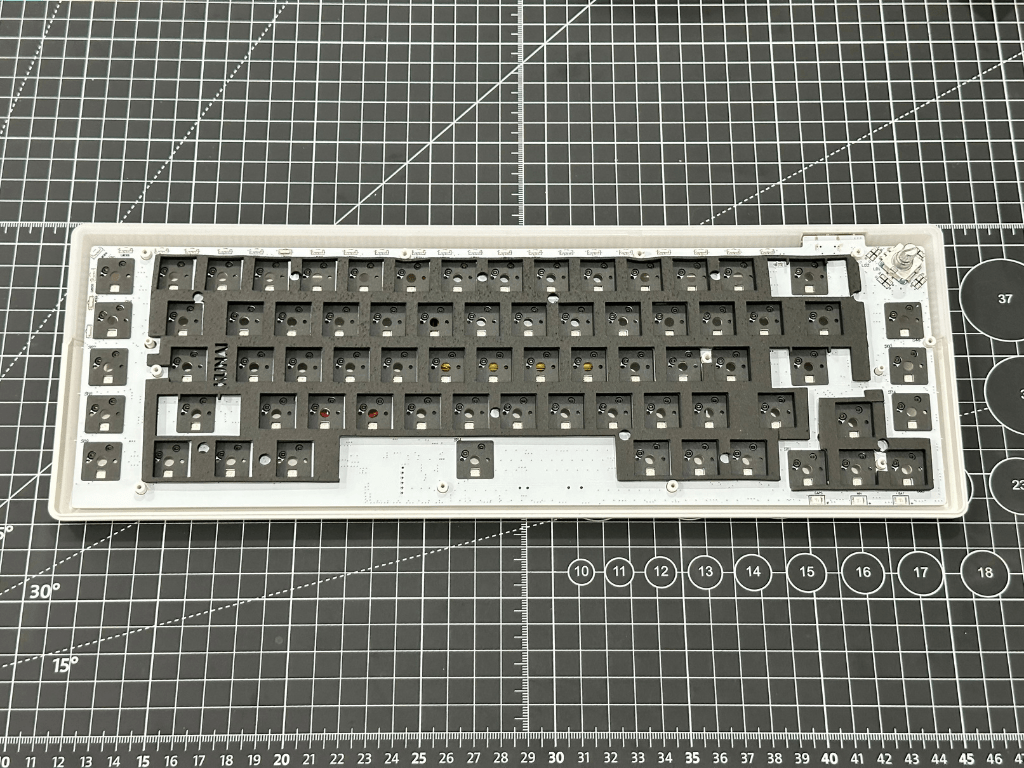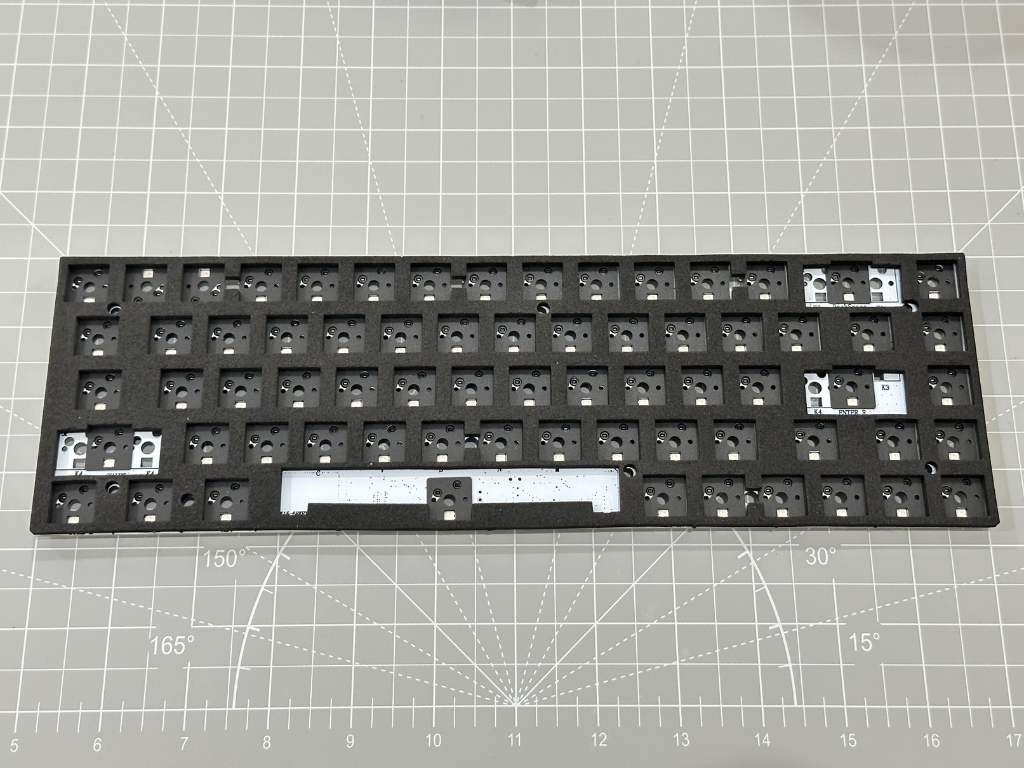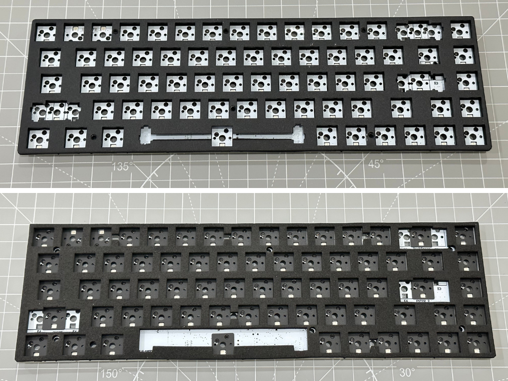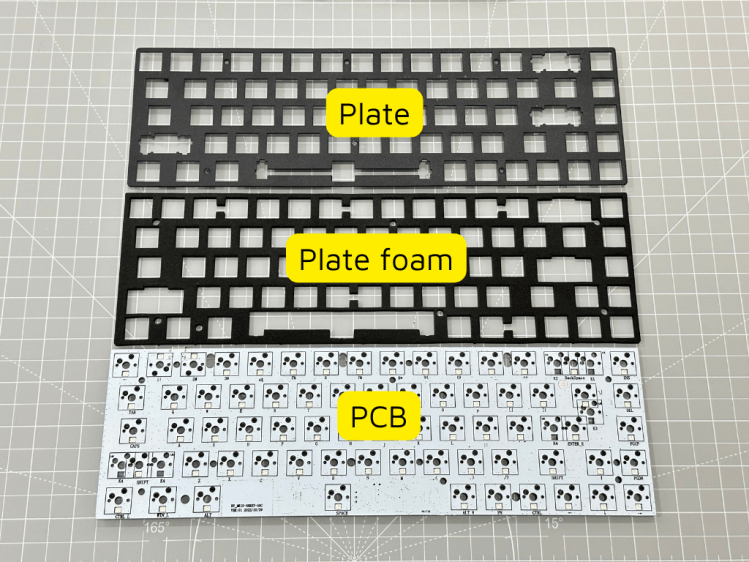Di antara PCB dan plate, ada Poron switch pad dan Poron plate foam. Sekarang banyak keyboard prebuilt menyertakan switch pad karena masih tren suara foam. Jika Anda sudah bosan karena suara keyboard hampir sama semua, Anda bisa melepaskan switch pad.
