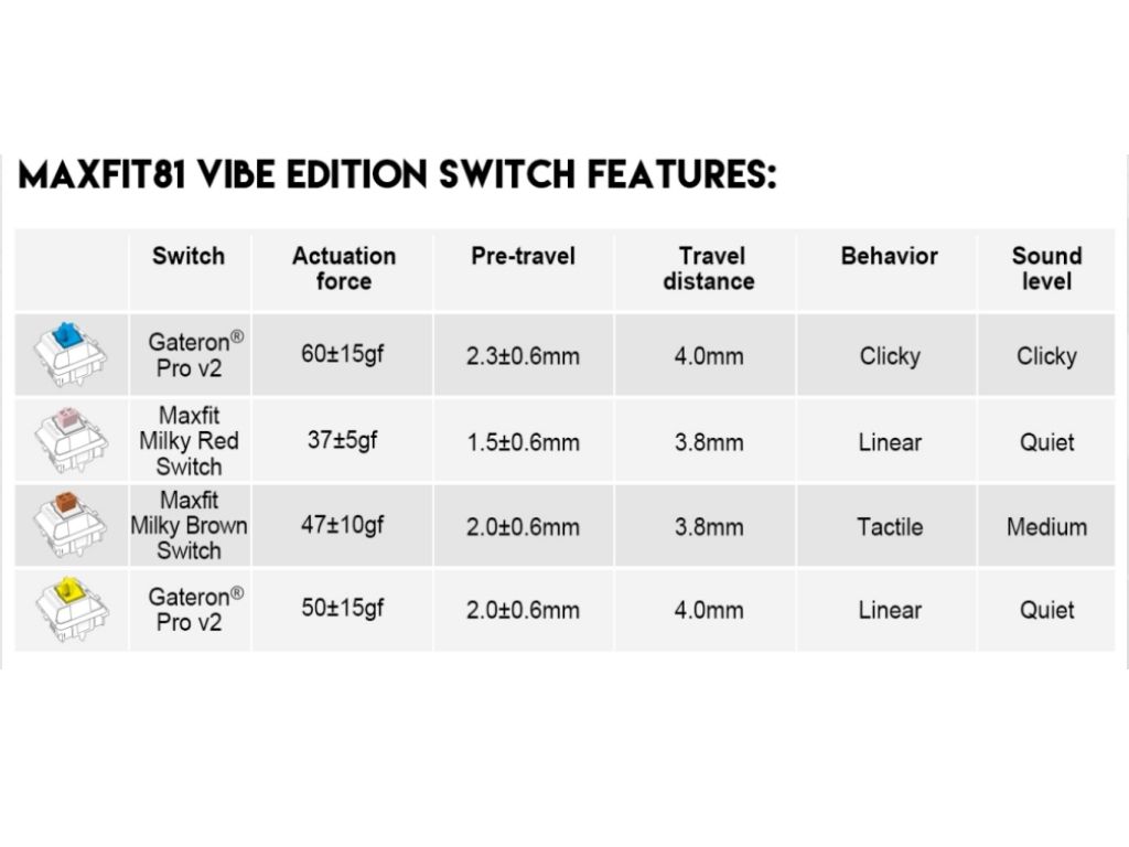 Saat ini tersedia dua layout, yaitu 75% (Maxfit Air 83) dan 96% (Maxfit Air 99), serta 2 macam low profile switch, red (linear) dan brown (tactile). Keduanya sudah tri-mode connection (Kabel USB-C, Bluetooth dan wireless 2.4Ghz).