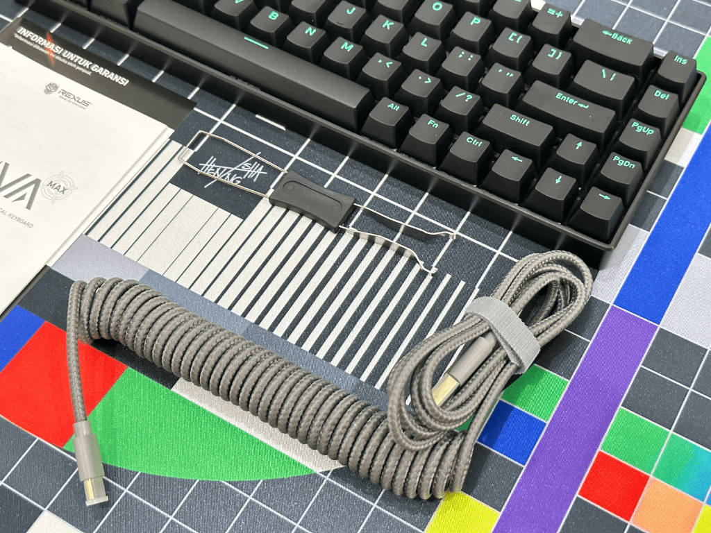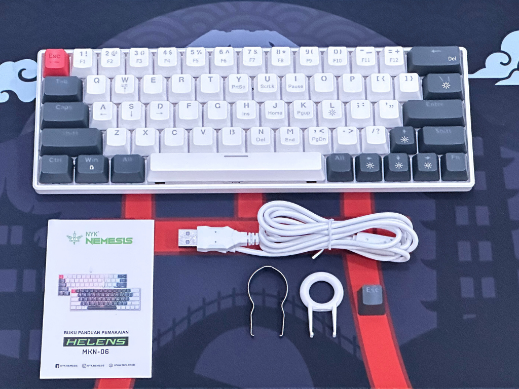 Isi box: 1. Xera Series 87 – TKL mechanical keyboard 2. Kabel USB Type C 3. Keycap dan switch puller 2-in-1 4. Extra keycap untuk aksen 5. User manual 6. Keyboard cover