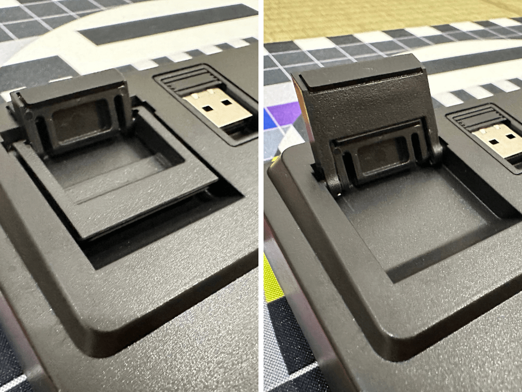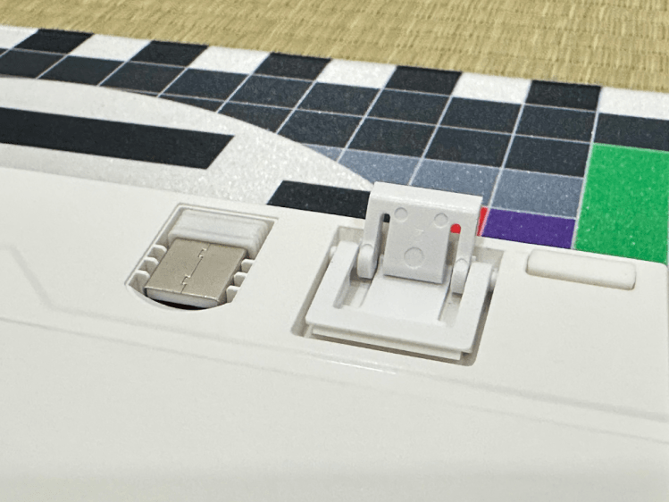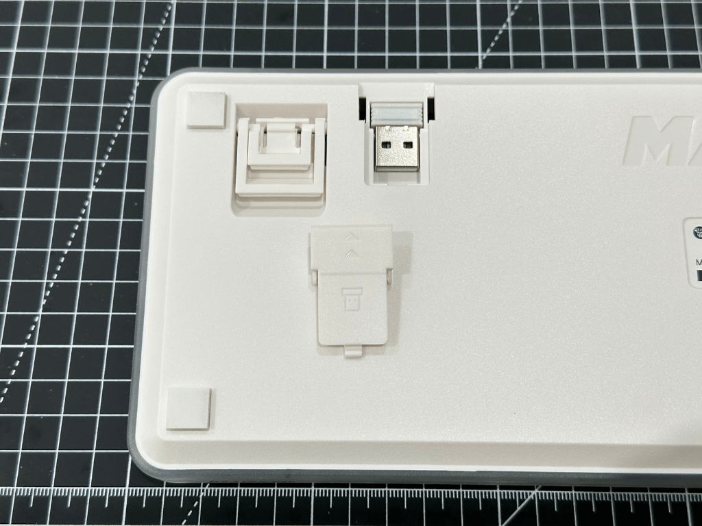 Di bawah juga ada tempat menyimpan dongle wireless 2.4Ghz. Dongle menempel ke magnet pada case. Magnetnya cukup kuat dan ketika saya hentakkan keyboard naik turun dengan keras, dongle tidak terlepas dari tempatnya. Tetapi jika Anda memang sering membawa keyboard ini kemana-mana, mungkin sebaiknya disimpan tersendiri atau ditutup washi tape supaya aman.