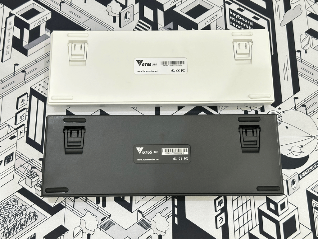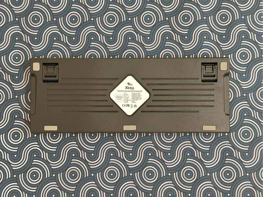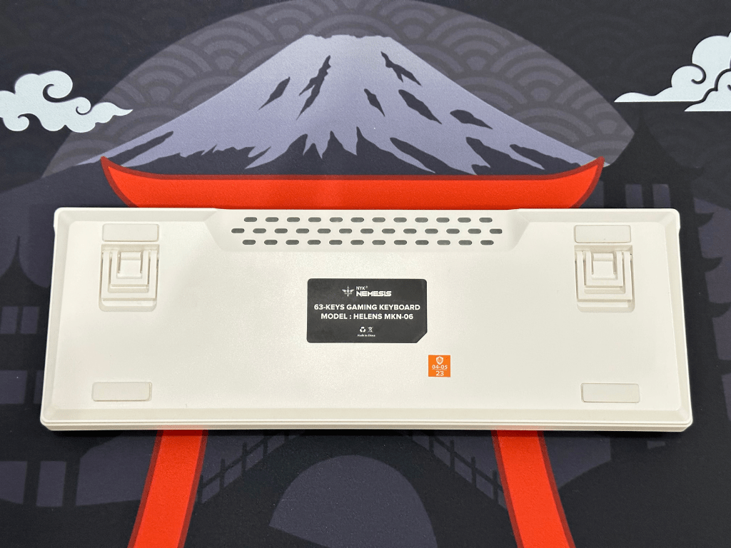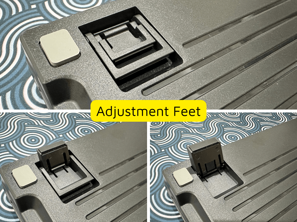 Di bawah ada rubber feet dan adjustment feet dengan dua ketinggian sehingga Anda bisa sesuaikan kemiringan keyboard dengan preferensi Anda.