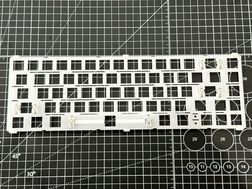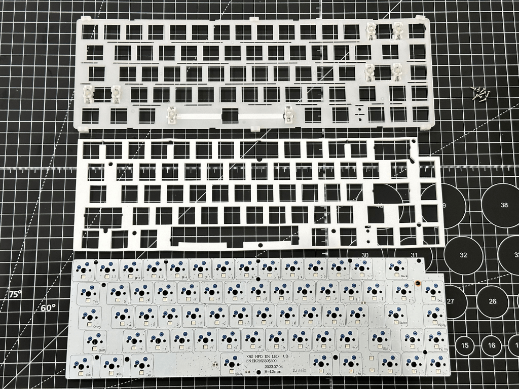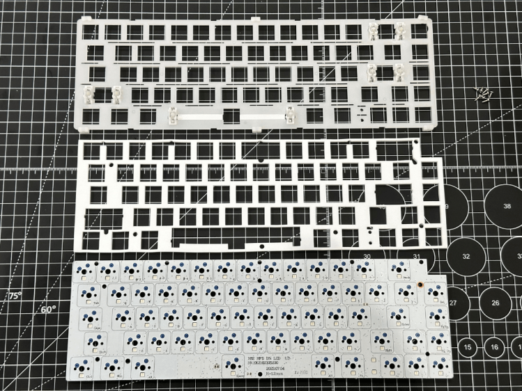 Ada empat bagian: 1. PCB hotswap north facing dengan ketebalan 1.6mm 2. Lembaran silicone switch pad setebal 0.4mm 3. Silicone plate foam 3.1mm 4. Polycarbonate (PC) plate 1.2mm