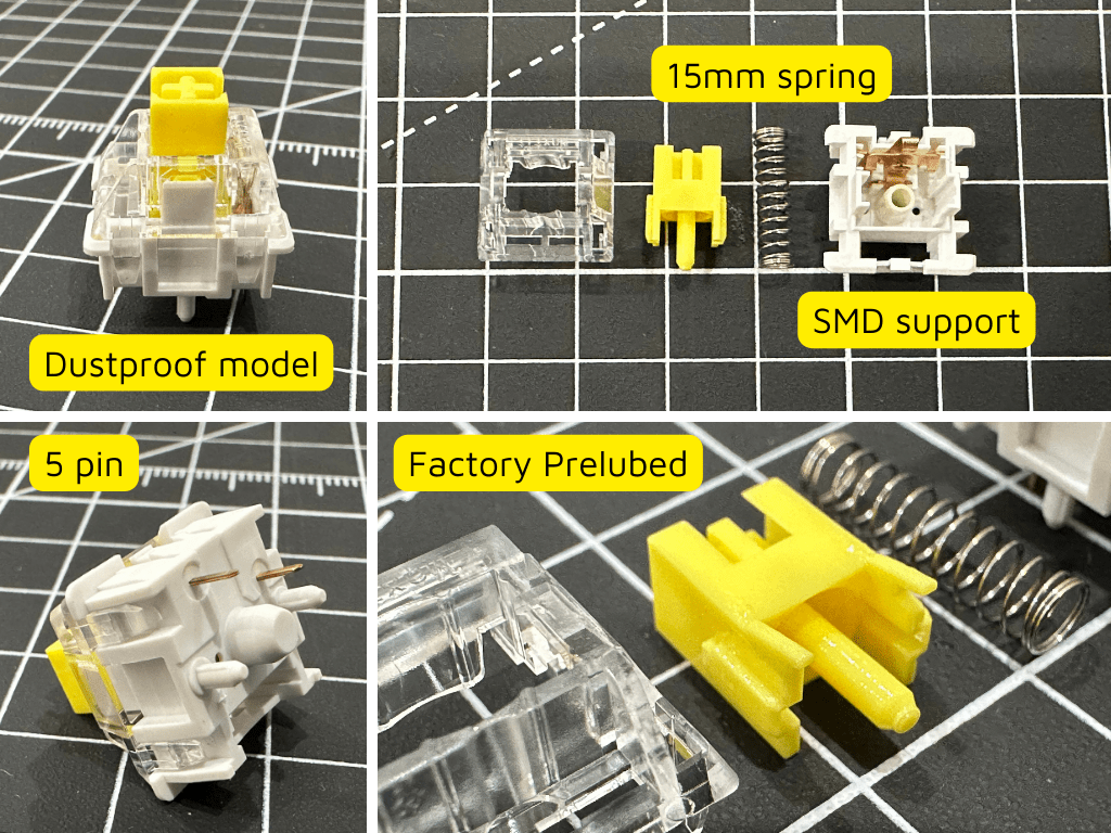 NOIR x YUNZII Vol 1 menyediakan beberapa pilihan switch bawaan: 1. Gateron Pro v2 Yellow (linear) – factory lubed 2. Gateron Pro v2 Brown (tactile) – factory lubed 3. Aflion Shadow (tactile) – long pole, factory lubed 4. KTT Orange (linear) – long pole, factory lubed 5. Silent Grey (silent tactile)