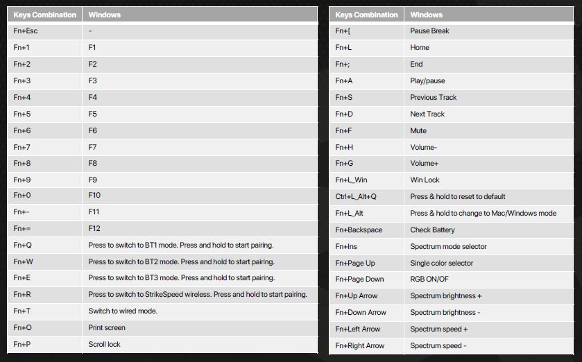 STATUS BATERAI Anda bisa melihat level baterai Anda dengan Fn + N dan angka 1-0 akan menyala berwarna merah sebagai indikator. Ini hanya bisa di mode Bluetooth.