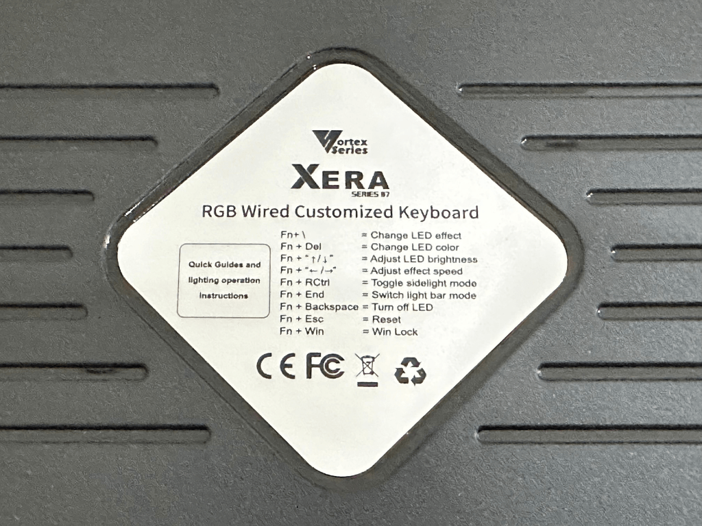 Pada bagian tengah, terlihat logo Vortexseries, Xera, dan petunjuk sederhana untuk pengaturan lampu RGB.
