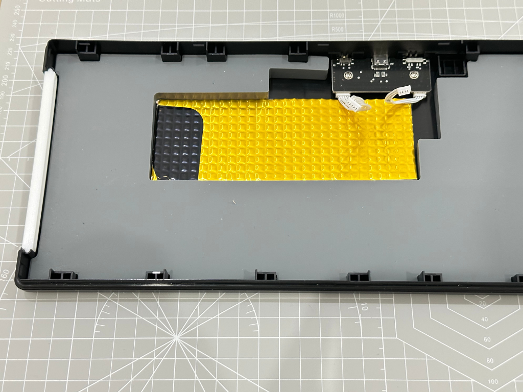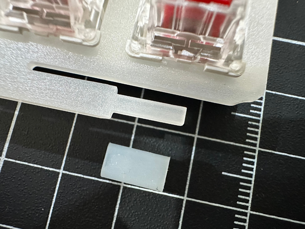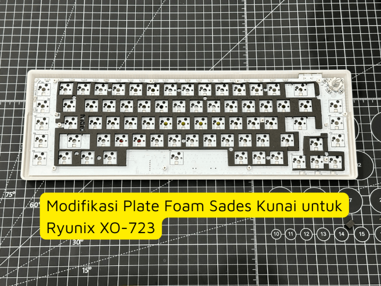 Untuk suara yang lebih padat, mungkin bisa menambahkan plate foam. Berhubung layoutnya lumayan unik, butuh custom plate foam. Sementara ini, saya menggunakan plate foam Sades Kunai yang saya potong-potong sedikit supaya menyesuaikan dengan bentuk Ryunix ini.
