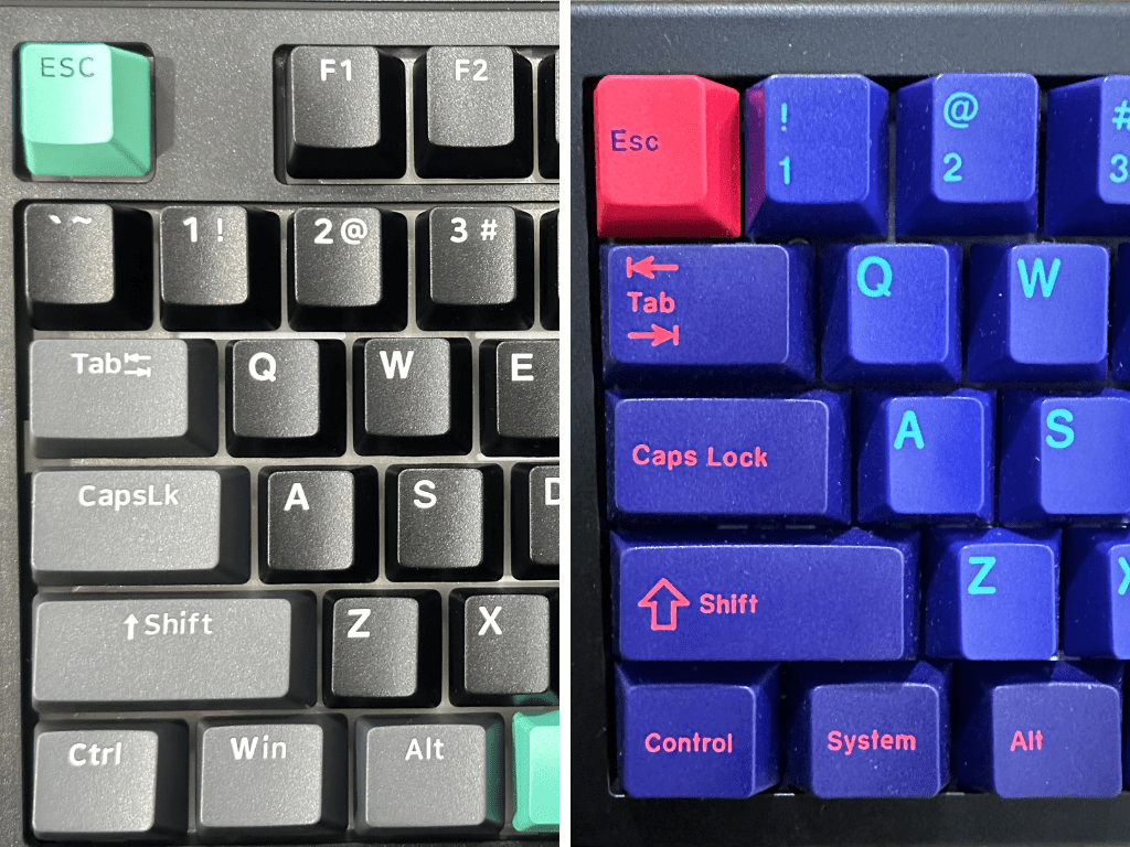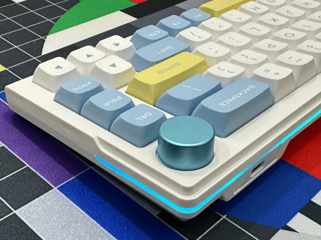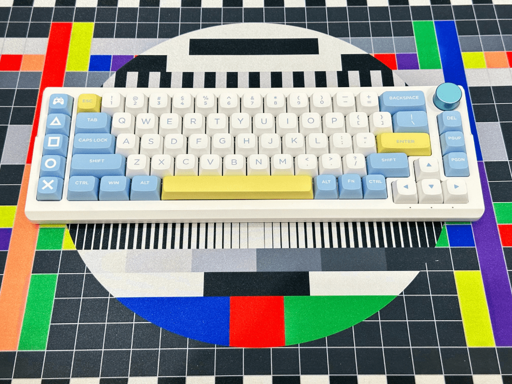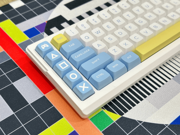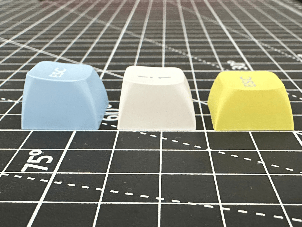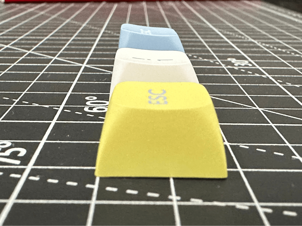 Kejanggalan lain adalah pada keycap aksen yang diberikan. Sepertinya ada kesalahan ketinggian. Paling mencolok adalah pada tombol ESC yang posisinya seharusnya di R1 dan tingginya sama dengan angka. Pada unit yang saya dapatkan, ESC warna biru lebih tinggi daripada Angka 1, sedangkan ESC warna kuning lebih rendah. Jadi ketika memasang biru maupun kuning, keduanya tidak sama dengan Angka 1.