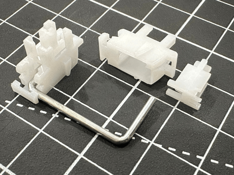 Stabiliser plate mount berwarna putih. Kondisinya stock, tidak ada lube. Untuk lebih optimal dan menghindari rattle, sebaiknya dilumasi menggunakan Krytox 205g0 pada housing dan stem, kemudian menggunakan Krytox atau Permatex pada wire. Berhubung stem sudah rata, Anda tidak perlu clipping kaki stem, cukup beri pelumas saja.