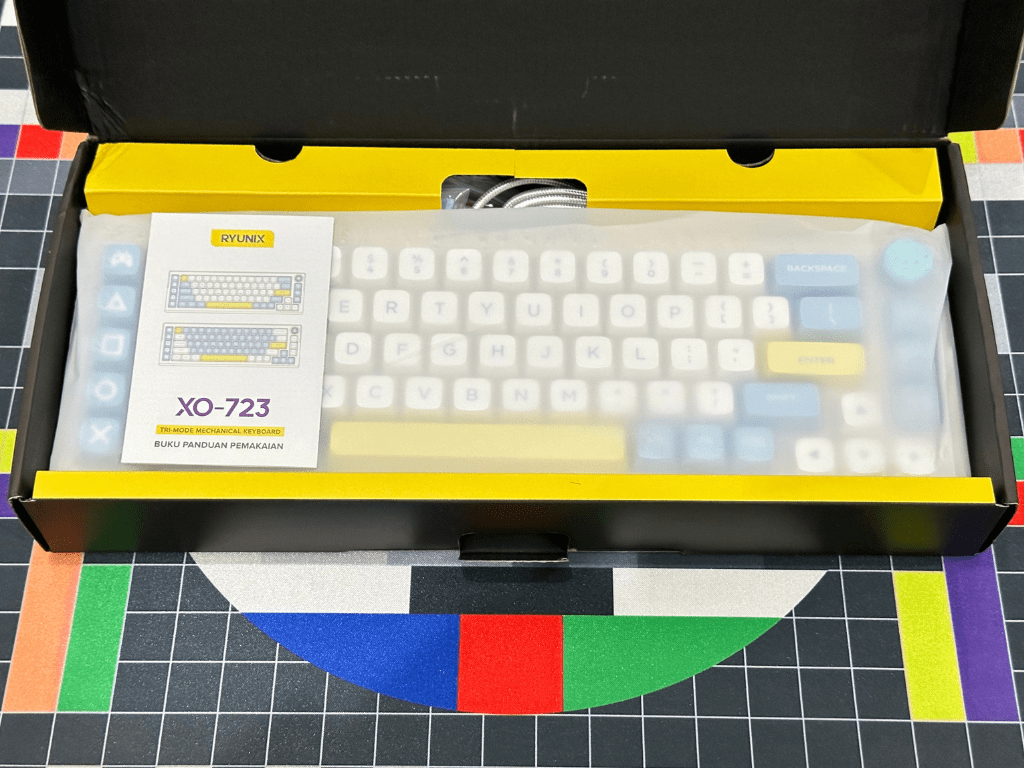 Saya mendapat kiriman Sades Ryunix XO-723 White Blue dengan Kailh Box White switch minggu lalu untuk menuliskan artikel ini. Varian warna keycap yang lain adalah Blue White, yaitu alpha numeric berwarna biru, sedangkan modifier berwarna putih.