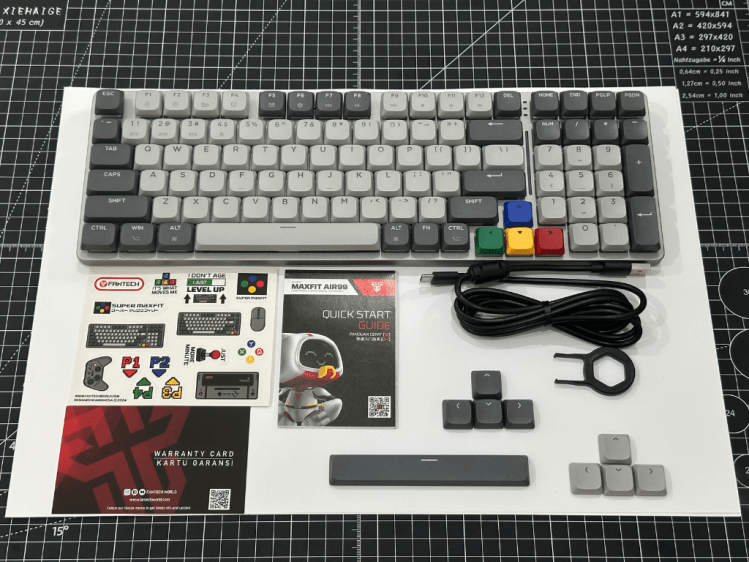Isi: 1. Low Profile Mechanical Keyboard – Fantech Maxfit Air 99 2. Kabel USB-C 3. Extra keycaps (arrows dan spacebar) 4. Keycap puller 5. Stiker 6. Kartu Garansi 7. Quick Start Guide – panduan singkat