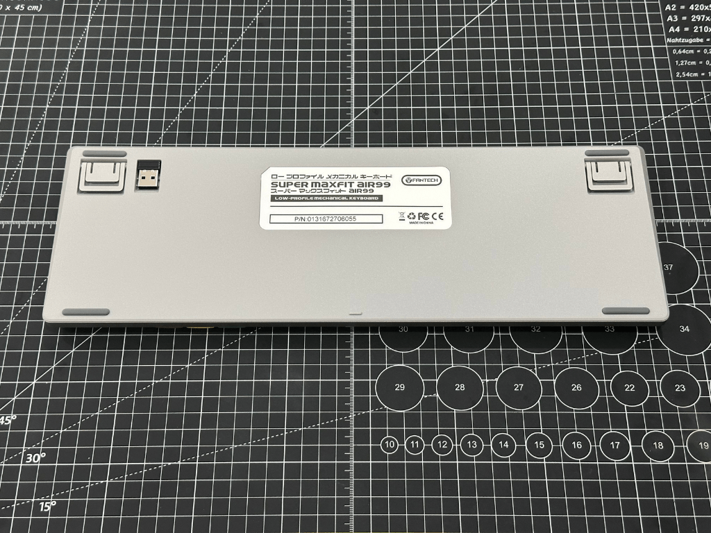 Walaupun super tipis, tetapi masih ada kaki yang membantu mengatur kemiringan keyboard, bisa flat atau 2 step kemiringan sesuai preferensi Anda. Saya lebih suka menggunakan posisi flat karena ketika pakai step, terkadang kakinya terlipat ketika keyboard terdorong ke depan.